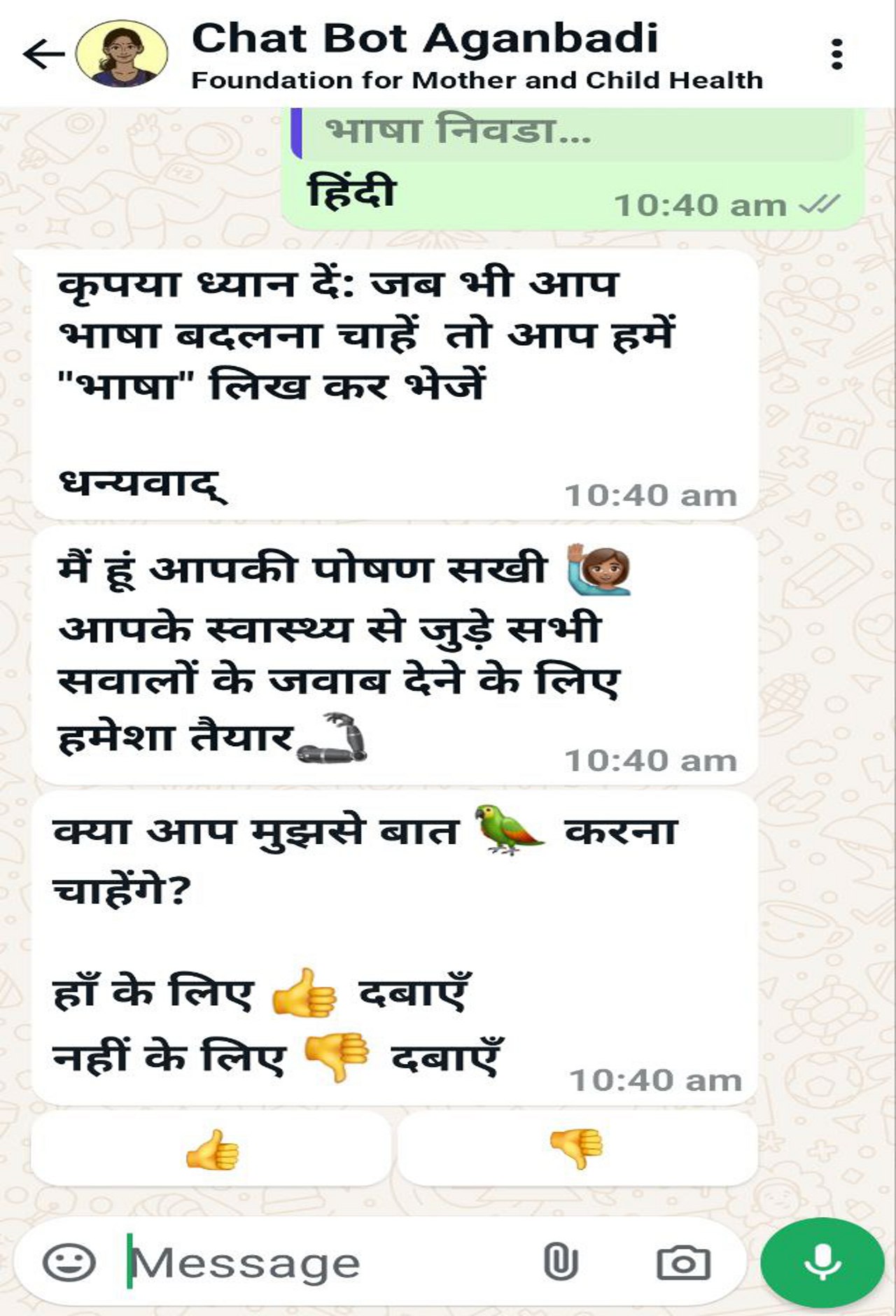 दीपिका बताती हैं कि आंगनबाड़ी कार्यकर्ता ने गृहभेंट के दौरान यह नंबर दिया और बताया कि एफएमसीएच संगठन ने इसे गर्भवती महिलाओं, धात्री माताओं और छोटे बच्चों की माताओं के लिए शुरू किया है। इस चैटबॉट पर संदेश भेजने से महिलाओं को स्वास्थ्य व पोषण संबंधी सलाह आसानी से मिल जाती है।