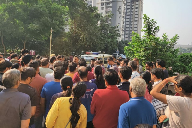 नोएडा सेक्टर-100 स्थित लोटस बुलेवर्ड सोसायटी में बच्चे की मौत के बाद हंगामा करते लोग।