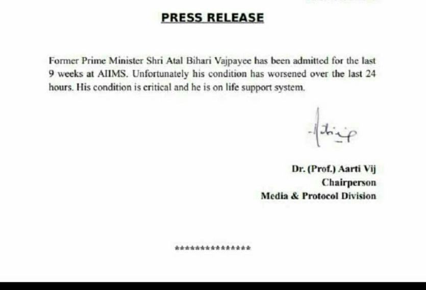 अटल बिहारी के एम्स में भर्ती होने के बाद से दो से तीन बुलेटिन जारी हो चुके है। इनमें उनकी हालत में सुधार नहीं दिख रहा है। वहीं डाॅक्टरों की टीम लगातार उन पर निगरानी पर लगी हुर्इ है। वहीं पूर्व प्रधानमंत्री अटल बिहारी वाजपेयी (Atal Bihari Vajpayee Critical) है। उन्हें देखने के लिए बीते 24 घंटे में उनकी हालात और बिगड़ी है। इससे पहले बुधवार को पीएम नरेंद्र मोदी (PM Modi), केंद्रीय मंत्री स्मृति ईरानी, पीयूष गोयल और मीनाक्षी लेखी उन्हें देखने एम्स पहुंचे। अटल बिहारी वाजपेयी लगभग दो महीने से AIIMS में भर्ती हैं। उन्हें (Atal Bihari Vajpayee) लाइफ़ सपोर्ट सिस्टम पर रखा गया है।वहीं इससे पहले एम्स के डायरेक्टर रणदीप गुलेरिया ने कहा था कि पूर्व पीएम अटल बिहारी वाजपेयी की तबियत स्थिर है।