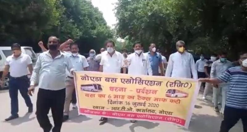 नोएडा। वैश्विक महामारी कोरोना के संक्रमण के मद्देनजर किए गए लॉकडाउन की अवधि के दौरान वाहन टैक्स में छूट की मांग को लेकर नोएडा बस एसोसिएशन ने गुरुवार को सेक्टर-35 स्थित एआरटीओ दफ्तर पर जोरदार प्रदर्शन किया। इस दौरान एसोसिएशऩ ने मुख्यमंत्री योगी आदित्यनाथ को संबोधित तीन सूत्रीय ज्ञापन एआरटीओ को सौंपा।