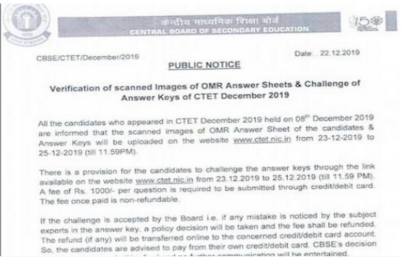 नोएडा। सीबीएसई (CBSE) की तरफ से सोमवार को दिसंबर 2019 केंद्रीय शिक्षक पात्रता परीक्षा (CTET) की आंसर की (Answer key) जारी कर दी है। आंसर की CTET की 2019 ऑफिशियल(Official Website) वेबसाइट ctet.nic.in पर जाकर चेक कर सकते है। जो अभ्यार्थी(Candidate) सीटेट (CTET) आंसर की से खुश नहीं है, वे ऑफिशियल वेबसाइट पर जाकर 25 दिसंबर तक आपत्ति दर्ज कर सकते हैं। अभ्यार्थी(Candidate) को एक हजार रुपये प्रति प्रश्न (Question) के हिसाब से आपत्ति दर्ज करानी होगी।
