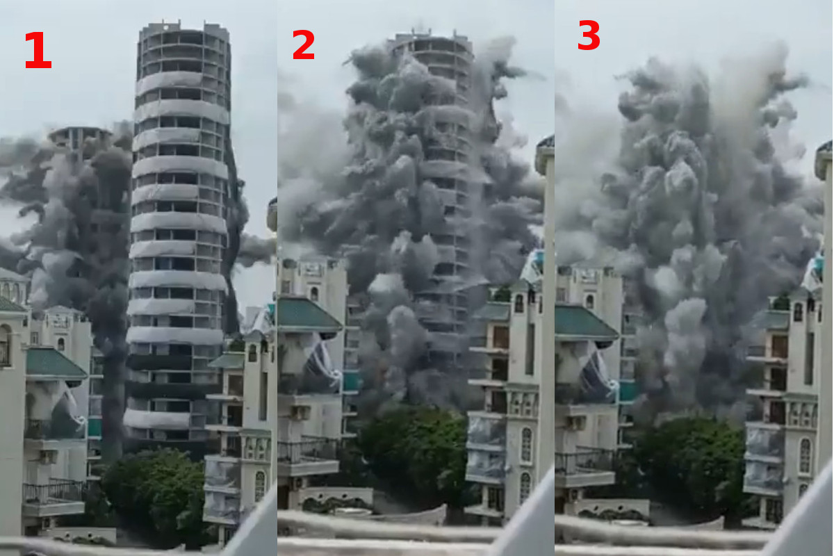 Noida Twin Towers Demolished : नोएडा सेक्टर-93 ए स्थित ट्विन टावर को तय समय पर जमींदोज कर दिया गया है। यह पहली बार है, जब सुरक्षित तरीके से देश में 100 मीटर से ऊंची इमारतों को 3700 किलो विस्फोटक का इस्तेमाल कर ध्वस्त कर दिया गया है। जैसे ही एडिफिस कंपनी के भारतीय ब्लास्टर चेतन दत्ता ने ब्लास्ट का फाइनल बटन दबाया तो ट्विन टावर ताश के पत्तों की तरह जमीन पर धराशायी हो गए। इतनी बड़ी इमारत झरने की तरह गिरी तो दूर से देखने वालों नेे भी दांतों तले उंगलियां दबा लीं। धमाका होते कई किलोमीटर दूर बैठे लोग भी हिल गए। लोगों ने भूकंप की तरह झटका महसूस किया। इस ब्लास्ट से एटीएस विलेज और सुपरटेक एमाराल्ड सोसायटी में भी नुकसान हुआ है। बताया जा रहा है कि हवा के चलते धूल का गुबार ग्रेटर नोएडा की तरफ बढ़ गया है।