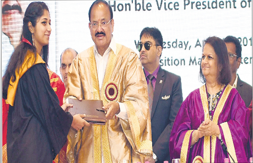 उन्होंने कहा कि छात्र पढ़ लिखकर भले ही विदेश जाएं, लेकिन उन्हें देश के लिए भी कुछ करना चाहिए। उपराष्ट्रपति ने कहा कि युवा नौकरी देने वाले बनें, न कि नौकरी मांगने वाले। उपराष्ट्रपति वेंकैया नायडू ने यहां 14 छात्र-छात्रओं को मेडल व डिग्री देकर सम्मानित किया। दीक्षांत समारोह में 287 छात्र-छात्रएं डिग्री पाकर खुशी से उछल उठे।