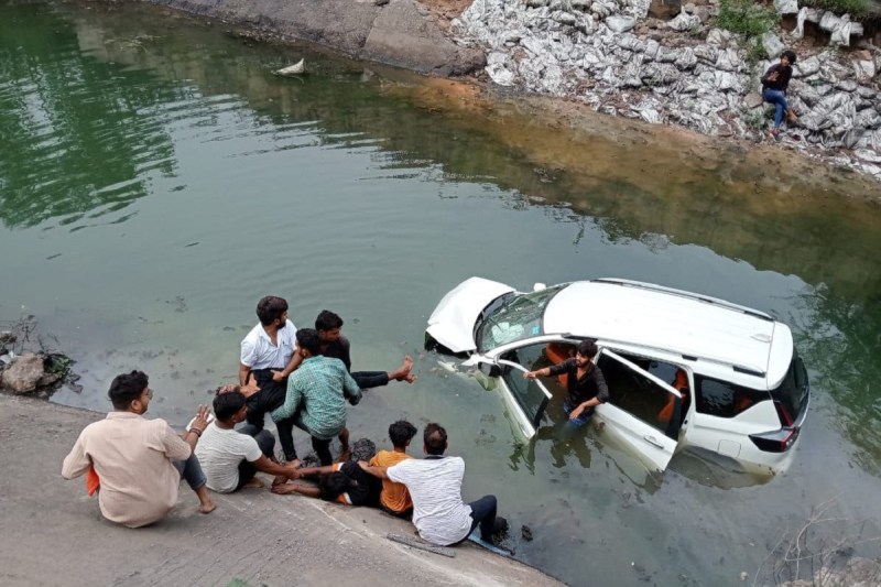 Accident: बेकाबू कार हसदेव नहर में गिरी, बाल-बाल बची चार युवकों की जान, देखें Video