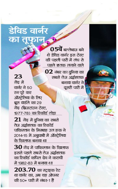 पहली पारी में शतक जमाने वाले डेविड वार्नर ने दूसरी पारी में मात्र 27 गेंदों पर आठ चौके तथा तीन छक्के उड़ाते हुए 55 रन बनाए। दूसरे ओपनर उस्मान ख्वाजा 79 रन पर नाबाद रहे। उन्होंने 98 गेंदों में पांच चौके और एक छक्का लगाया। कप्तान स्टीवन स्मिथ ने तीसरे नंबर पर बल्लेबाजी करते हुए 43 गेंदों पर आठ चौके तथा एक छक्का उड़ाया। पीटर हैंड्सकोंब 25 गेंदों पर 40 रन बनाकर नाबाद रहे।