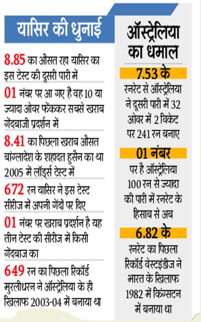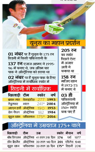 सिडनी। ऑस्ट्रेलिया और पाकिस्तान के बीच तीसरे क्रिकेट टेस्ट का चौथा दिन यहां रिकॉर्डों की बौछार के नाम हो गया। ऑस्ट्रेलिया ने मेहमान टीम को जीत के लिए 465 रन का असंभव लक्ष्य दिया। रिकॉर्डों की बौछार की शुरुआत पाकिस्तान के 39 वर्षीय अनुभवी बल्लेबाज यूनुस खान ने की और वह नाबाद 175 रन की पारी के साथ सिडनी क्रिकेट ग्र्राउंड पर 175+ रन का स्कोर बनाने वालों में सर्वाधिक उम्र के लिहाज से तीसरे नंबर पर आ गए। इसके बावजूद पाकिस्तान अपनी दूसरी पारी में 315 रन पर सिमट गई।
