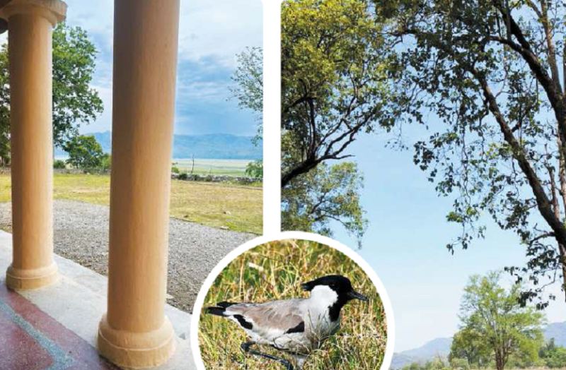 अंग्रेजों के समय की बनी ढिकाला फॉरेस्ट लॉज, जिसके खंभे ध्यान आकर्षित करते हैं। दाएं चित्र में जिम कॉर्बेट राष्ट्रीय उद्यान का ढिकाला जोन और नदी के पास रहने वाली टिटहरी (इनसेट में)।