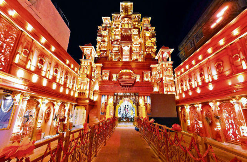 दुर्गा पूजा के भव्य मंडप, जिन्हें वहां 'पेंडल' कहते हैं, समुदायों के साथ बड़ी कंपनियों के विज्ञापनों के सहयोग से बनाए जाते हैं। यह बात मुझे मालूम थी, इसलिए विज्ञापन जगत से जुड़े अपने भाई पीयूष की मदद ली। फिर एक सुबह पुराने शहर के शाही घरों की दुर्गा पूजा देखने के लिए एक ट्रैवल एजेंट के साथ टिकट खरीदे। जब प्रवेश-पत्रों की छपी पुस्तिका हमारे हाथ में आई तो लगा कि इतने पंडाल हम देख भी पाएंगे कि नहीं। हमने एक सूची बनाई और सुबह होते ही निकल पड़े। ये 'सरबोजनिन' यानी कि सार्वजनिक पूजा स्थल सिर्फ पूजा नहीं, बल्कि कला और रचनात्मक सोच से परिचय कराने का तरीका है। हर पंडाल किसी खास विषय को ले कर बनाया जाता है जो आज का भी हो सकता है, पुराना भी, तो कोई विदेश का भी। 2017 में एक ओर मेगा हिट फिल्म बाहुबली का माहिषमती का भव्य महल था तो दूसरी ओर इंग्लैंड की महारानी एलिजाबेथ का बकिंघम महल, और दोनों में विराजमान देवी दुर्गा।