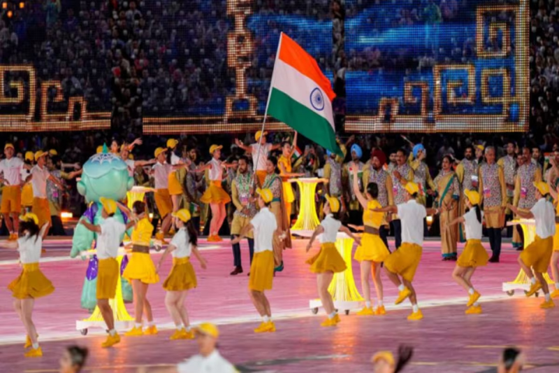 सुनहरे रंग की औपचारिक पोशाक में सुसज्जित भारतीय दल मार्चपास्ट में आठवें स्थान पर निकला, जिसने प्रत्येक दल को मिनटों के भीतर स्टेडियम के बाहर ले जाया, अन्य पिछले समारोहों के विपरीत, जिसमें एथलीटों को प्रतिज्ञा और प्रकाश व्यवस्था के लिए स्टेडियम में रहने की अनुमति दी जाती थी ताकि वे ज्योति को प्रज्ज्वलित करने ,संगीत सुनने और ताल पर नाचने का आनंद ले सकें।