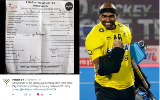 एयर एशिया एयरलाइंस के जरिए सफर कर रहे श्रीजेश ने 1500 रुपये के जुर्माने वाली रसीद को अपने ट्विटर अकाउंट पर पोस्ट किया और पूछा कि एयरलाइंस ने मेरे स्पोट्र्स बैग पर जुर्माना लगाया है, जिसका वजन 15 किग्रा से भी कम था। क्या वे मुझसे उम्मीद कर रहे हैं कि मैंने मेकअप किट रखी हुई है? क्या मजाक है?