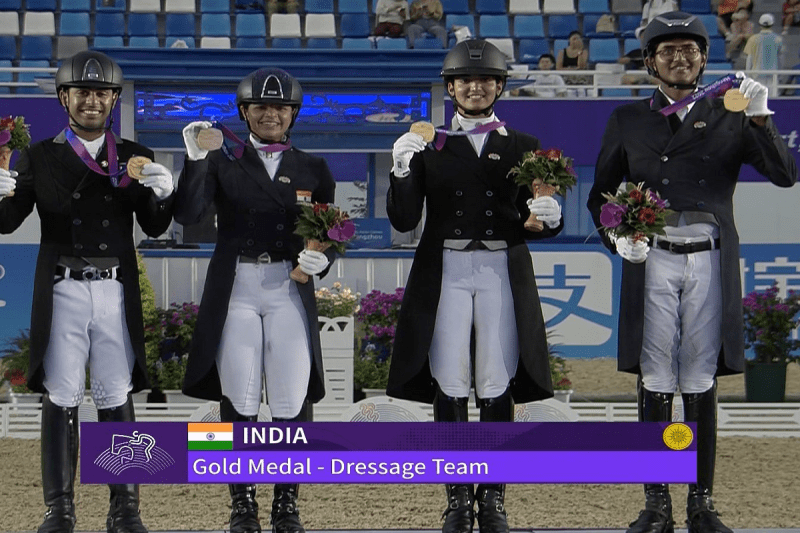 भारतीय टीम ने 209.205 प्वाइंट्स हासिल करते हुए चीन को पछाड़ा। 204.882 प्वाइंट्स के साथ चीन दूसरे और 204.852 प्वाइंट्स के साथ हांगकांग तीसरे नंबर पर रहा। भारत को 41 साल बाद घुड़सवारी ड्रेसेज में गोल्ड मेडल मिला है। भारत ने इस इवेंट में आखिरी मेडल साल 1982 में जीता था। 1982 के खेलों में भारतीय घुड़सवारों ने इस खेल की तीन अलग-अलग स्पर्धाओं में गोल्ड जीता था। उसके बाद अब जाकर इन चार घुड़सवारों ने इतिहास रचा है।