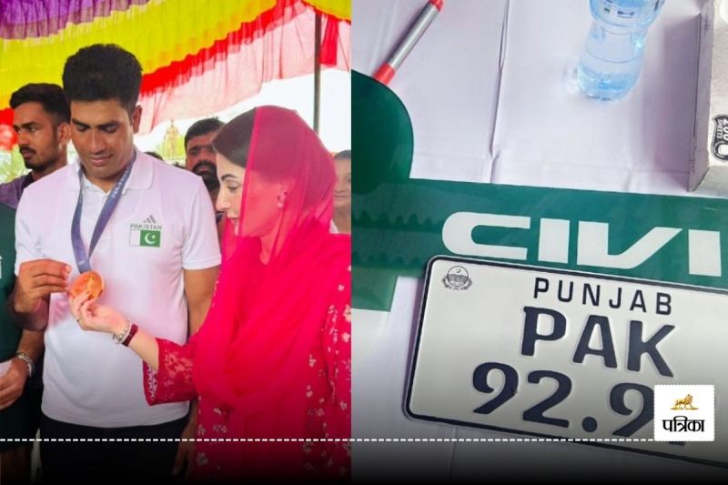 Maryam Nawaz gift to Arshad Nadeem: पाकिस्तान के पंजाब सूबे की मुख्यमंत्री मरियम नवाज ने पेरिस ओलंपिक के गोल्ड मेडलिस्ट भाला फेंक खिलाड़ी अरशद नदीम के घर पर मुलाकात की। अरशद नदीम पाकिस्तान के खानेवाल के मियां चुन्नू गांव के रहने वाले हैं। नदीम ने पेरिस ओलंपिक के जैवलिन थ्रो फाइनल में 92.97 मीटर की थ्रो के साथ गोल्ड मेडल हासिल किया था। मरियम नवाज ने अरशद नदीम को 10 करोड़ पाकिस्तानी रुपए का चेक और एक कार गिफ्ट के तौर पर भेंट की। खास बात यह है कि कार का नंबर 9297 है।