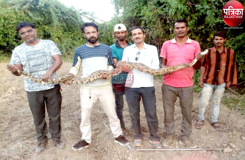 समिति अध्यक्ष महावीर दाधीच ने बताया कि सुमेरपुर उपखंड क्षेत्र के जाखोड़ा ग्राम के रेलावा स्थित वागाजी फार्म हाउस निवासी कुलदीपसिंह राजपुरोहित के कृषि कुएं पर अजगर आ गया। राजपुरोहित ने इसकी सूचना स्नैक एक्सपर्ट नरेश आर्य को दी। जिस पर आर्य ने स्नेक कैचर फागुभाई मिस्त्री, रमजान खान, महावीर दाधीच, रूपाराम देवासी को मौके पर भेजा। मौके पर पहुंचकर सभी स्नेक कैचरों ने मौके की नजाकत को समझते हुए कृषि कुएं से कड़ी मशक्कत कर 9 फीट लम्बे रॉक पायथन प्रजाति के अजगर को काबू में किया। इसके बाद अजगर को जवाई बांध क्षेत्र के जंगलों में सुरक्षित छोड़ दिया। इस अवसर पर देवाराम, महावीरसिंह, छोगसिंह, रवि कुमार, मोहम्मद रफीक सिलावट मौजूद रहे।