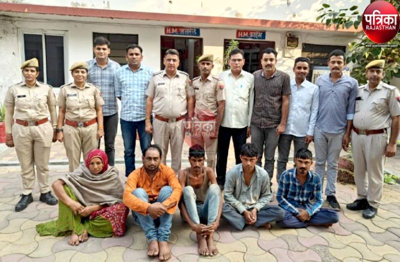 पुलिस ने चितौड़गढ जिले के कपासन थाना के मेवदा कॉलोनी निवासी राकेश (25) पुत्र प्रकाश कंजर, कामली (55) पत्नी प्रकाश कंजर, सिरोही जिले के नांदिया निवासी नरेश (30) पुत्र रामदयाल उर्फ रामकिशन नट, गुजरात के बनासकांठा जिले के कुम्भारिया अम्बाजी निवासी शंकरभाई (27) पुत्र बालाभाई नट व पप्पूभाई (21) पुत्र बालाभाई नट को गिरफ्तार किया है।