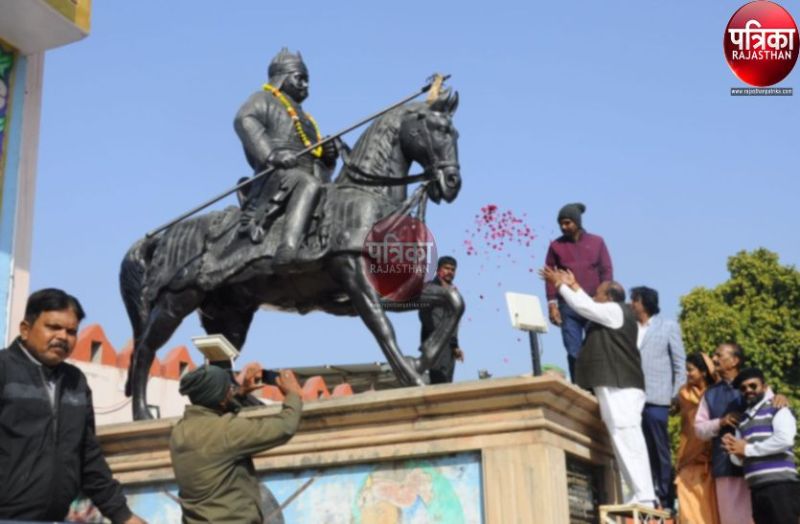 महाराणा प्रताप की प्रतिमा पर पुष्प अर्पित करते लोग।