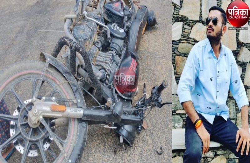 हादसे के बाद मोके पर पड़ी बुलेट व मृतक चेतन चौधरी का फाइल फोटो।