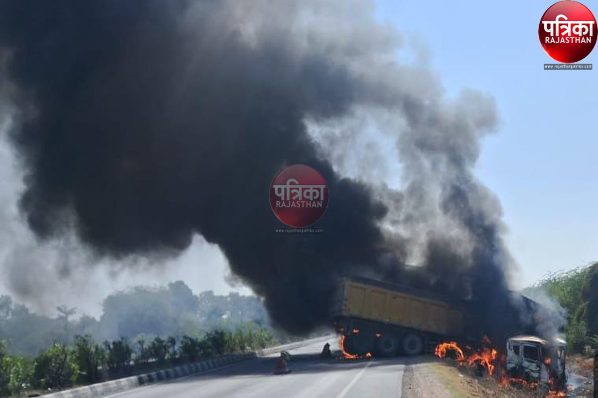 हादसे के बाद कंटेनर व डंपर में लगती आग।