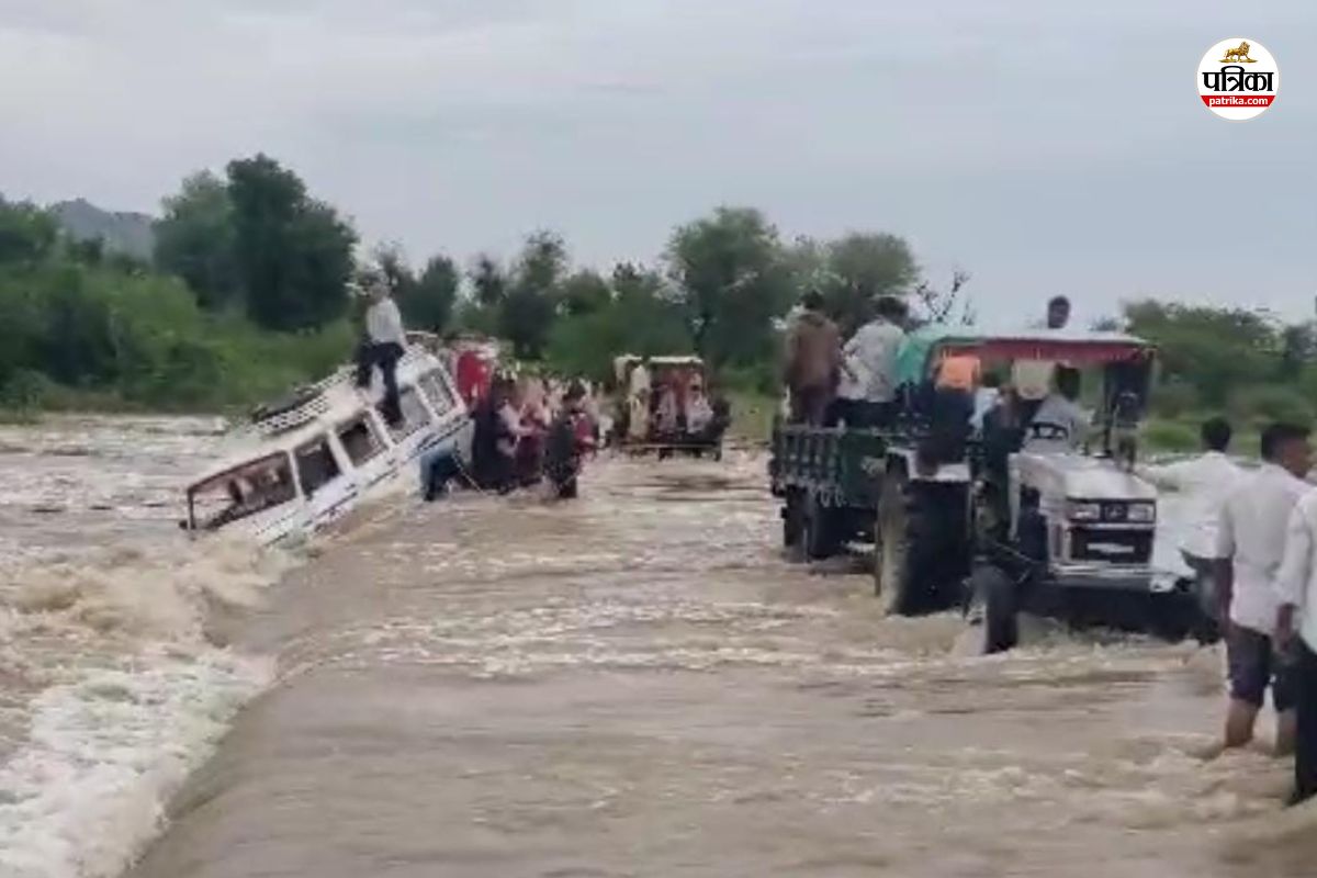 सेवाड़ी के निकट लुन्दाडा में सवारियों से भरी गाड़ी बही। फोटो: पत्रिका