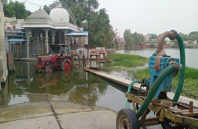 लाखोटिया उद्यान में विराजमान बाबा लाखोटिया महादेव के दरबार में श्रावण के अंतिम सोमवार को मेला भरेगा। वहां आने के भैरूघाट से दो मार्ग है, जिनमें से एक भैरूजी मंदिर के आगे से है। जिस पर बिपरजॉय तूफान व मानसून की बरसात से तालाब भरने पर पानी आ गया है। यह पानी भरने का बड़ा कारण नगर परिषद की ओर से रामनगर के पुराने घाट पर मिट्टी डालकर बनाई पाल है। उसे हटाने पर यह पानी कम हो सकता था, लेकिन नगर परिषद ने दूसरा रास्ता अपनाया। उसने तालाब के इस पानी को खाली करने के लिए भैरूजी मंदिर पर मड पम्प लगाए है। उनसे पानी पाइपों के माध्यम से सिटी टैंक में डाला जा रहा है। शहरवासियों की माने तो यह वैसा ही है जैसे गागर से सागर खाली करना हो। पम्प भी पिछले 36 घंटे से चल रहे है, लेकिन पानी अभी तक भैरूजी मंदिर के आगे से उतरा नहीं है।