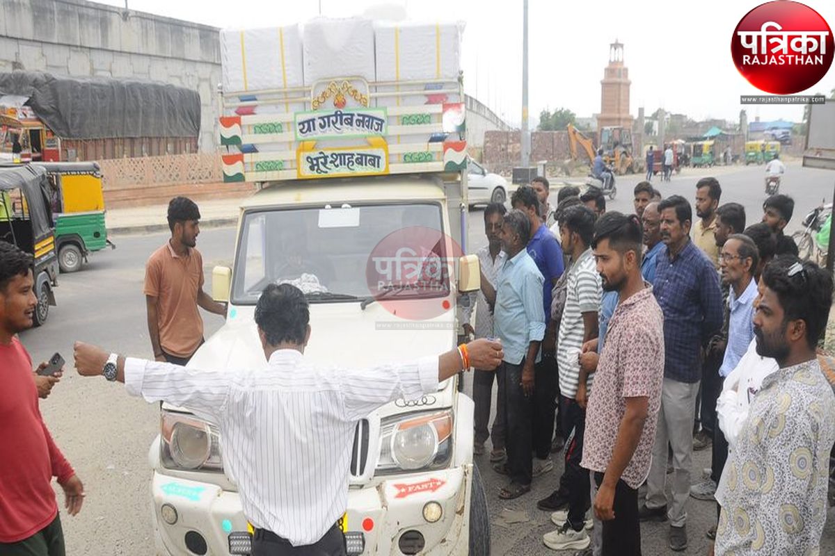 पाली के ट्रांसपोर्ट नगर के मुख्य द्वार पर एक वाहन को प्रवेश से रोकते व्यवसायी।
