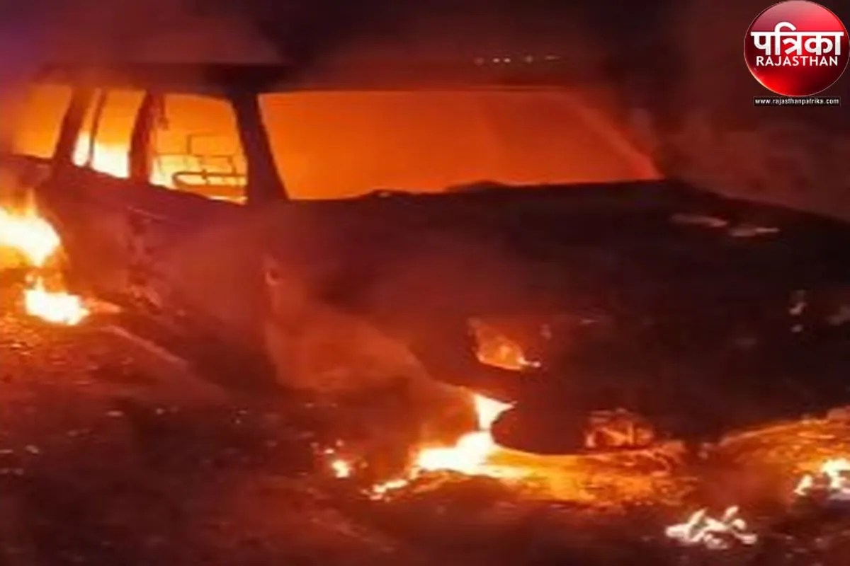 पाली जिले के रोहट थाना क्षेत्र के बाड़ाई गांव के पास कार में लगी आग।