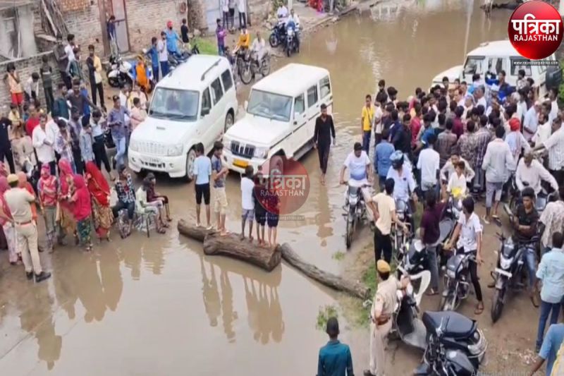 पाली जिले के बाली-पिंडवाड़ा मेघा हाईवे पर जलभराव से परेशान होकर रास्ता रोक प्रदर्शन करते ग्रामीण।