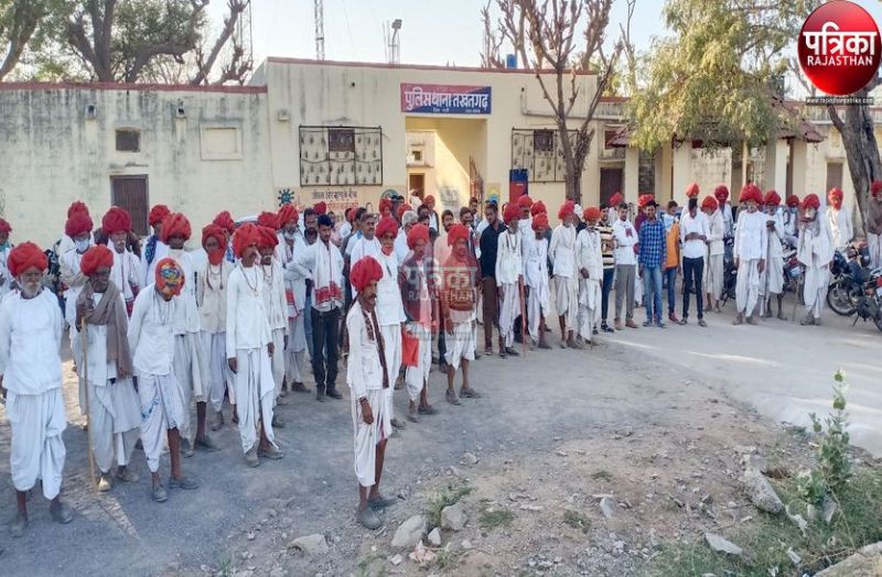 एकाएक थाने के बाहर लाल पगड़ीधारकों की उपस्थिति को देखकर हर राहगिर भी जानकारी के लिए आतुर दिखा। समाज के लोगों ने थाना प्रभारी चौधरी से अपनी मांगे रखी। थाना प्रभारी के आश्वासन के बाद वे पुन: घरों की तरफ लौटे। तखतगढ़ थाने में जनवरी व फरवरी माह में समाज के पंचों के खिलाफ परस्पर चार मामले पंजिबंद है। इन मामलों की निष्पक्ष जांच की मांग की है।