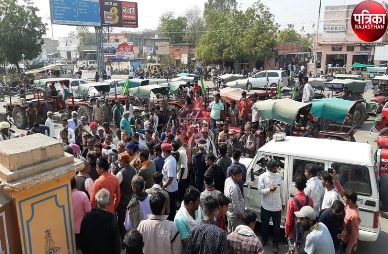 पाली/सोजत। जिला किसान एवं खेत मजदूर कांग्रेस के नेतृत्व में शुक्रवार को चंडावल व सांडिया के ग्रामीण केंद्र सरकार द्वारा लागू किए गए किसान कानून [ farmers law ] के विरोध में जुलूस निकालते हुए एसडीएम कोर्ट [ SDM Court ] पहुंचे। जहां पर नारेबाजी कर मुख्यमंत्री [ CM Ashok Gahlot ] व राज्यपाल [ Governor ] के नाम ज्ञापन एसडीएम को सौंपा। ट्रेक्टरों में सवार होकर महावीर सर्किल पहुंचे किसानों ने जमकर नारेबाजी कर अपना विरोध दर्ज कराया।
