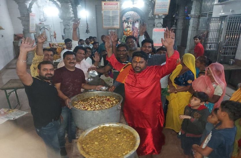अन्नकूट महोत्सव में जयकारे लगाते श्रद्धालु।