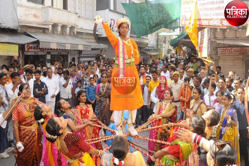 पाली शहर में राम नवमी पर निकाली गई शोभायात्रा में हाथ में तलवार लेकर प्रदर्शन करती युवती।
