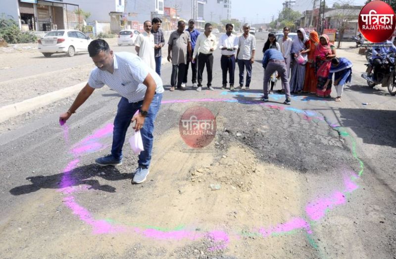 पाली शहर की सड़कों के हालात किसी से छिपे हुए नहीं है। शिकायतों के बावजूद इन सड़कों की सार-सभांल करने वाला कोई नहीं है। इसके चलते लोगों में आक्रोश बढ़ता जा रहा है। शनिवार को शहरवासियों ने गांधीवादी तरीके से जयपुर हाइवे को जोड़ने वाली नया गांव की क्षतिग्रस्त सड़क के बीच हुए गड्ढों पर गुलाल से गोले बनाकर अनूठे तरीके से विरोध जताया।