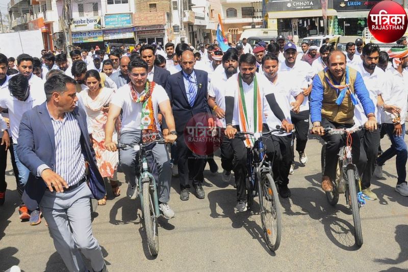 पाली शहर में एनएसयूआई की नशा छोड़ो, जीवन जोड़ो यात्रा में शामिल होकर साइकिल चलाते पूर्व उप मुख्यमंत्री सचिन पायलट।
