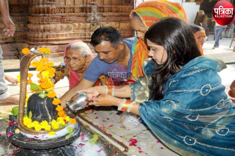 पाली में श्रावण के दूसरे सोमवार को सोमनाथ मंदिर में जलाभिषेक करते श्रद्धालु।