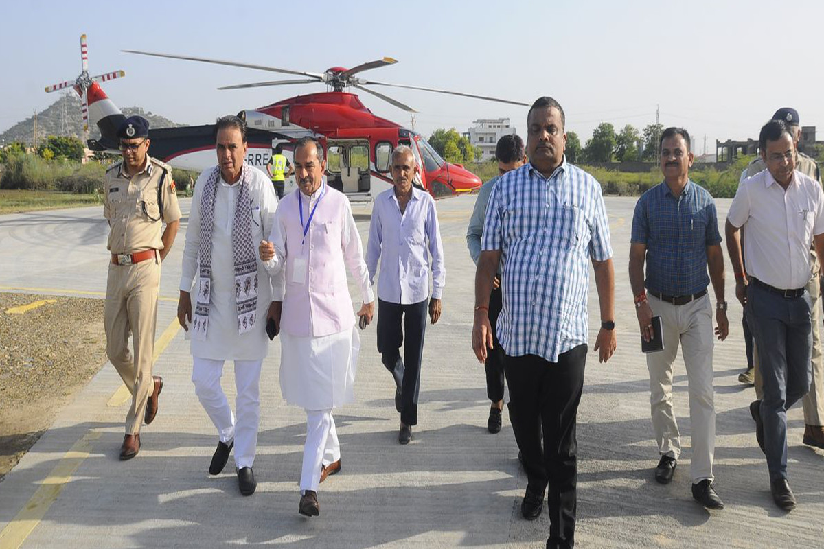 पाली के कन्या महाविद्यालय परिसर में बने हेलीपेड पर पहुंचे भाजपा प्रदेशाध्यक्ष व मंत्री जोगाराम पटेल। फोटो- पत्रिका