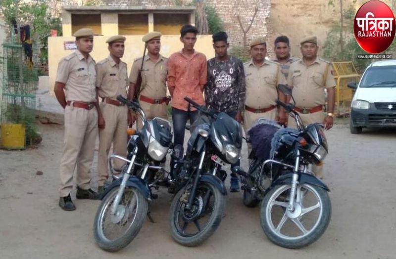 पाली/जैतारण। जिले के जैतारण शहर सहित आसपास के क्षेत्रों से मोटरसाइकिलें चुराने के मामले मे जैतारण पुलिस ने गुरुवार को दो आरोपियों को गिरफ्तार किया है। उनके कब्जे से चोरी की तीन मोटरसाइकिलें बरामद की है। पुलिस का दावा है कि और भी चोरी की वारदातें इन चोरों से खुल सकती है। उनसे पूछताछ जारी है।