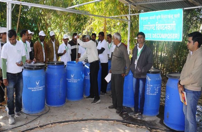 केवीके में वेस्ट डिकम्पोजर बनाने के बारे में बताते वैज्ञानिक।