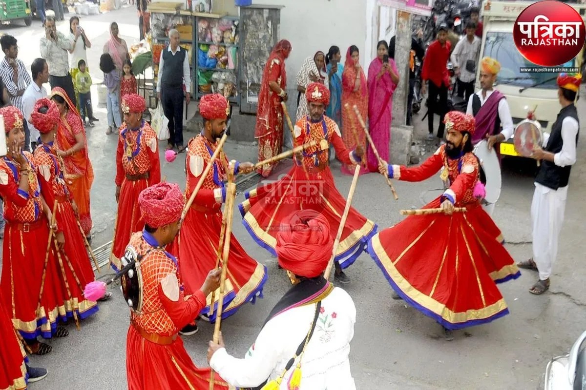 पाली शहर में निकाली गई शोभायात्रा में ढोल-थाली पर नृत्य करते कलाकार।