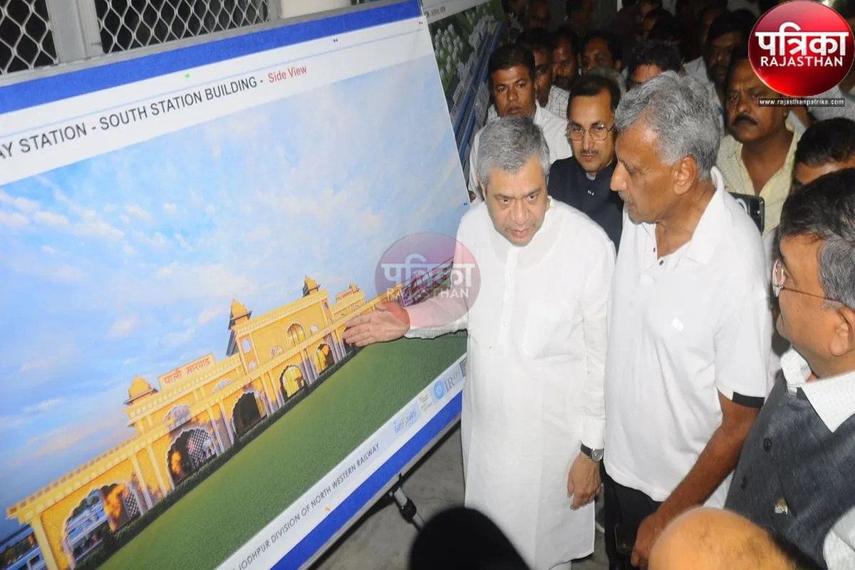 पाली के रेलवे स्टेशन के नए बिल्डिंग की प्रदर्शनी का अवलोकन करने के दौरान अधिकारियों से चर्चा करते रेल मंत्री अश्विनी वैष्णव।