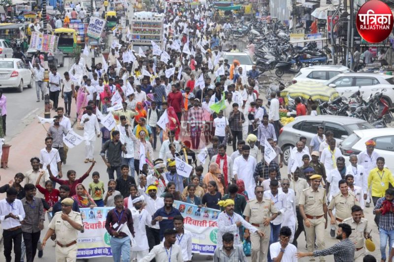 विश्व आदिवासी दिवस पर पाली शहर में निकाली गई रैली में शामिल भील समाज के लोग।