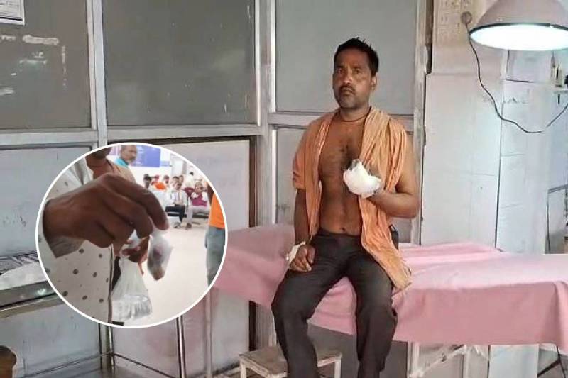अस्पताल में इलाजरत रामकिशोर व इंसर्ट में कटी हुई उंगली। (फोटो सोर्स- पत्रिका)