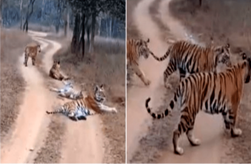 अचानक रास्ते पर आकर बैठ गया बाघ का पूरा परिवार, थम गईं लोगों की सांसें, दुर्लभ वीडियो आया सामने
