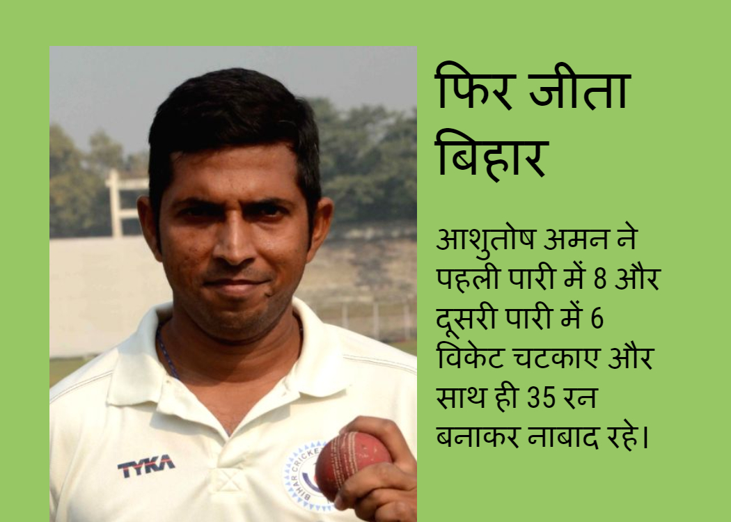 पटना । बिहार ने क्रिकेट की दुनिया में जोरदार वापसी की है। शिलांग में मेघालय के खिलाफ चार दिवसीय रणजी मैच को बिहार की टीम ने डेढ़ दिन में ही जीत लिया। एक पारी और 71 रनों की यह जीत बिहार की नई क्रिकेट टीम की मजबूती को दर्शा रही है। फिर एक बार बिहार क्रिकेट के स्टार साबित हुए हैं ऑल राउंडर आशुतोष अमन। आशुतोष ने पहली पारी में 8 विकेट और दूसरी पारी में 6 विकेट चटकाए और साथ ही 35 रन बनाकर नाबाद भी रहे। उन्हें प्लेयर ऑफ द मैच ठहराया गया।