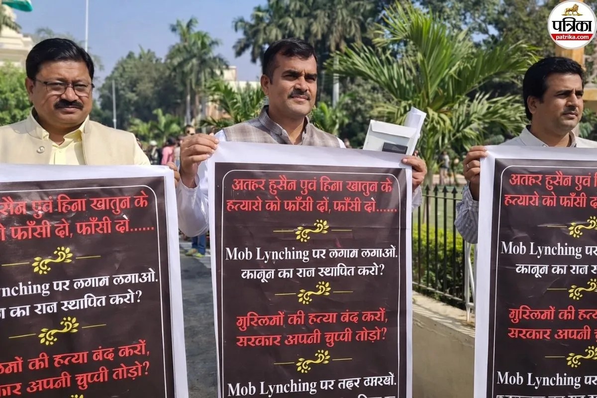Bihar Assembly: AIMIM के विधायकों ने गुरुवार को बिहार विधानसभा परिसर में कानून-व्यवस्था की स्थिति को लेकर जोरदार विरोध प्रदर्शन किया। पोस्टर और बैनर लेकर विधायकों ने नीतीश सरकार पर महिलाओं, अल्पसंख्यकों और व्यापारियों की सुरक्षा करने में नाकाम रहने का आरोप लगाया। विरोध प्रदर्शन के दौरान, बैनरों पर अथर हुसैन और हिना खातून के मामलों का ज़िक्र किया गया और सरकार से जवाब मांगा गया। पोस्टरों पर "मॉब लिंचिंग बंद करो," "कानून का राज स्थापित करो," और "हत्यारों को फांसी दो" जैसे नारे भी लिखे थे।