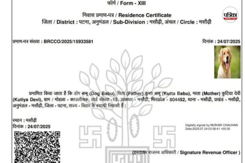 Dog Babu Viral Certificate पटना के मसौढ़ी अंचल से संबंधित ‘डॉग बाबू’ के नाम से एक आवास प्रमाण-पत्र जारी मामले में पटना जिला प्रशासन ने सोमवार को त्वरित कार्रवाई करते हुए एक अधिकारी के निलंबन कर दिया, वहीं एक अन्य कर्मी को सेवा से मुक्त कर दिया है। इसके साथ ही सरकार ने पटना जिलाधिकारी डॉ. त्यागराजन एसएम को इस पूरे मामले की जांच के आदेश दिए हैं।