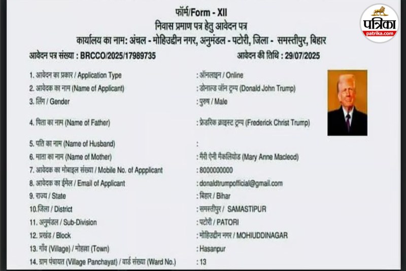 यह फर्जी आवेदन 29 जुलाई 2025 को ऑनलाइन पोर्टल पर डाला गया। इसमें डोनाल्ड जॉन ट्रंप को समस्तीपुर जिले के मोहिउद्दीन नगर प्रखंड के हसनपुर गांव का निवासी बताया गया है। आवेदन संख्या BRCCO/2025 वाले इस फॉर्म में ट्रंप की फोटो के साथ पिता का नाम फ्रेडरिक क्रिस्ट ट्रंप और माता का नाम मैरी ऐन मैकलियोड दर्ज है। डेट ऑफ बर्थ 10 जून 1946 लिखी गई है और आधार कार्ड भी संलग्न है, जो जांच में फर्जी पाया गया।