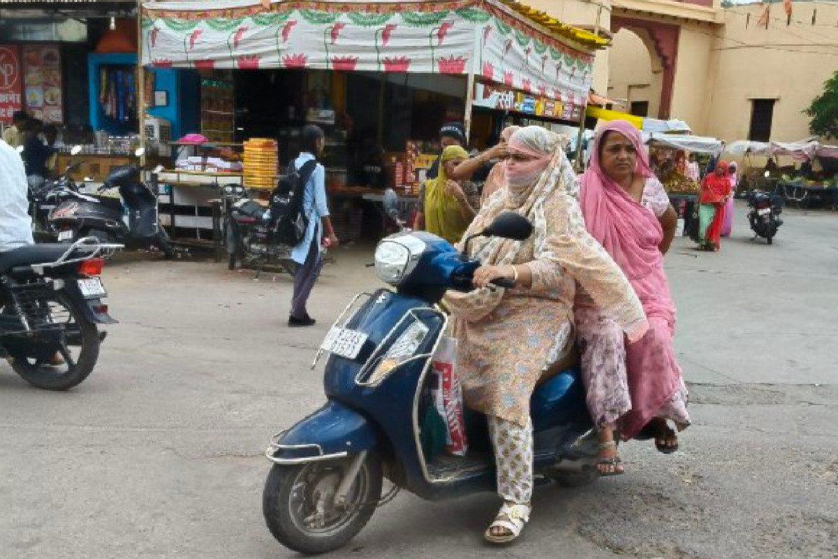 गर्मी से बचने के लिए मुंह पर कपड़ा बांध कर स्कूटी चलाती युवती। फोटो- पत्रिका
