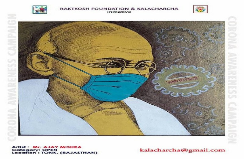 जयपुर. रक्तकोष फाउंडेशन और कला चर्चा समूह के संयुक्त तत्वावधान में 'कोरोना से सुरक्षा एवं जागरूकता' विषय पर आयोजित राष्ट्रीय स्तर की ऑनलाइन पोस्टर एवं चित्रकला प्रतियोगिता में टोंक के कलाकार अजय मिश्रा की कृति 'कोरोना से आजादी की जंग' को सर्वश्रेष्ठ कृति के लिए चयनित किया गया। अजय ने बताया कि यह कृति कैनवास पर मिश्रित माध्यम से बनाई गई थी। इसमें गांधी जी को मास्क पहने हुए चित्रित किया हैं और चित्र की पृष्ठभूमि पर कोरोना के वायरस को उकेरा गया है। साथ ही एक संदेश 'लड़ेंगे हम कोरोना से' भी लिखा गया हैं। इस चित्र के माध्यम से गांधीवादी तरीके से कोरोना से लडऩे के लिए संदेश दिया गया हैं। रक्तकोष फाउंडेशन के राष्ट्रीय अध्यक्ष रामगोपाल बिश्नोई ने बताया कि इस प्रतियोगिता में आई सभी स्तरीय प्रविष्टियों को हमने अपने कलाचर्चा और रक्तकोष फाउंडेशन के फेसबुक पेज पर साझा किया था। कुल तीन श्रेणियों में यह प्रतियोगिता आयोजित की गई थी, जिसमे कुल 429 प्रविष्टियां प्राप्त हुई थी। निर्णायक मंडल में वरिष्ठ कला शिक्षाविद सीएस मेहता, वरिष्ठ कलाकार अजित वर्मा, सुरेंद्र कुमार सोनी, सुरेंद्र सिंह, कैलीग्राफी आर्टिस्ट हरिशंकर बालोठिया, भावना सक्सेना, ताराचंद शर्मा जैसे नाम शामिल थे।