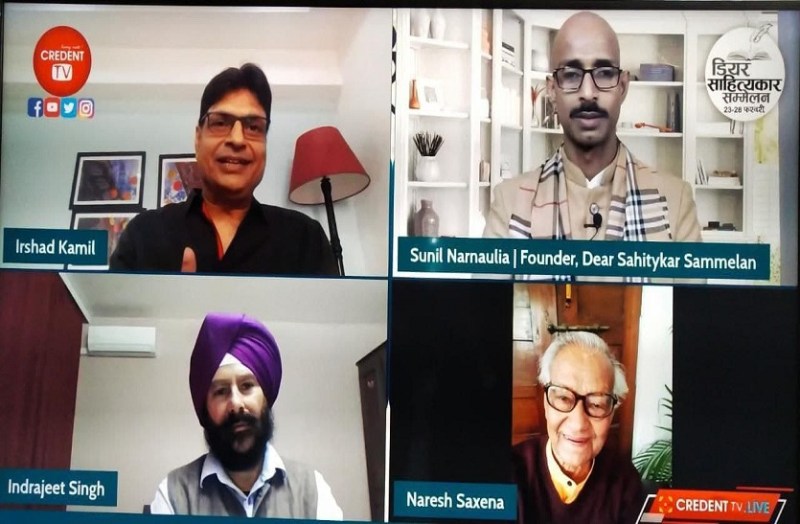 जयपुर. मनस्विता समूह और प्रधी साहित्य एवं सेवा संस्थान के संयुक्त तत्वावधान में ऑनलाइन आयोजित किए जा रहे छह दिवसीय अंतरराष्ट्रीय सहित्यिक आयोजन डियर साहित्यकार सम्मेलन के पहले दिन पहला सत्र गीत और कविता के नाम रहा। इस सत्र में तन्हा तेरे बगैर, इश्क में तेरे, आज दिन चढ्या, जैसे बेहद चर्चित और सफल गानों के गीतकार- कवि गीतकार इरशाद कामिल और समुद्र पर हो रही है बारिश, विनोद चारुशीला, चंबल एक नदी का नाम जैसी कविताओं के रचयिता कवि नरेश सक्सेना ने कवि कौन गीतकार कौन विषय पर खुलकर चर्चा की। कार्यक्रम के फाउंडर डायरेक्टर सुनील नारनोलिया ने बताया इरशाद कामिल ने कविता लिखने, समझने और आत्मसात के साथ-साथ समाज के संप्रेषण पर जोर दिया, वहीँ नरेश सक्सेना ने कहा कि कविता में समाज की चिंताओं का समावेश होना चाहिए कविता की अभिव्यक्ति में सरलता, संवेदना होनी चाहिए, कविता का अंतिम लक्ष्य संवेदना है । भाषा व्याकरण विचार कविता को सफल बनाते हैं।
