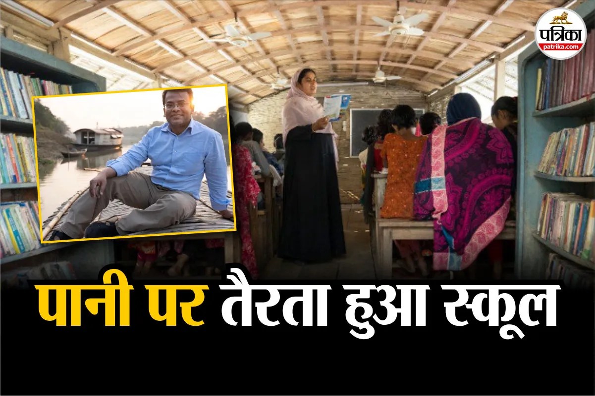 Floating School in Bangladesh: भारत की तरह बांग्लादेश भी नदियों का देश है। बांग्लादेश भी बाढ़ की समस्या से हर साल दो-चार होता रहता है। बाढ़ की चपेट में आने पर सड़क और गांव से स्कूल तक पहुंचना मुश्किल या असंभव सा हो जाता है। ऐसे में बांग्लादेश के एक शख्स ने पानी में तैरती हुई नौका पर पूरा स्कूल बना दिया और एक नई इबारत लिख डाली।