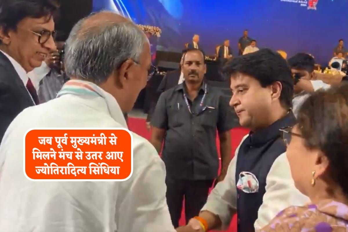 एक निजी कार्यक्रम में केंद्रीय मंत्री ज्योतिरादित्य ने जैसे ही दिग्विजय सिंह को देखा, तो मंच से उतर आए हाथ मिलाया, माफी मांगी और चर्चा में आ गए(फोटो सोर्स: X वीडियो)